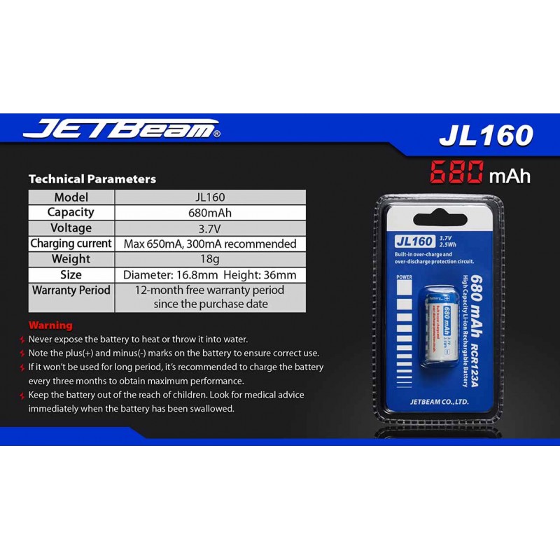 Accu Lithium-Ion Niteye Jetbeam RCR123A - 680mAh.