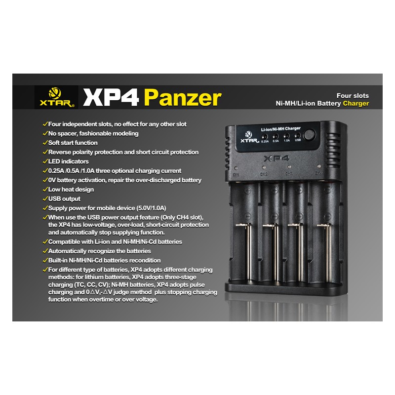 Peut charger les piles Ni-MH AAA / AA / A / C / SC et les batteries Li-ion 10440 / 14500 / 14650 / 16340 / 17500 / 17670 / 18350 / 18500 / 18650 / 18700 / 22650 / 25500 / 26650 (3,6/3,7V).